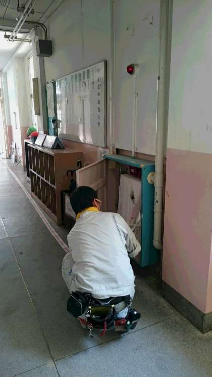 専門の業者の方が、校内の消火器、消火ホース、火災感知器など消防設備の点検を行いました。