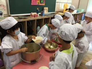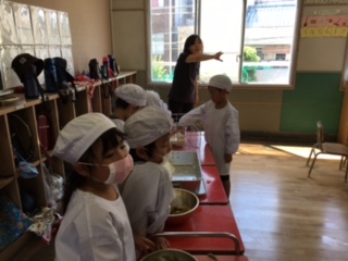 2学期最初の給食です。1年生は準備・配膳に慣れ、とてもスムーズにできるようになりました。