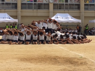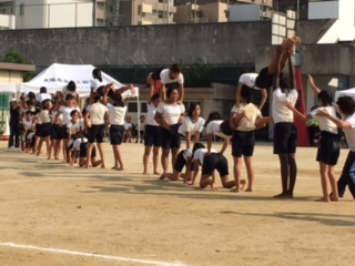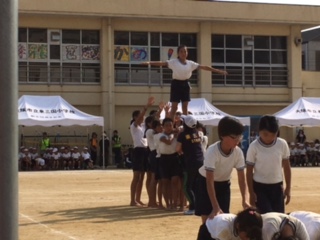 5・6年生の団体演技の組み立て体操です。後半の集団の演技です。