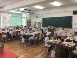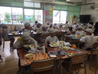 4日(火)〜7日(金)は給食週間です。本日は交流給食で、1年生と5年生、2年生と6年生、3年生と4年生が一緒に給食をいただきました。上記から1・5年生、2・6年生、3・4年生です。献立は、もずくと豚ひき肉のジュ—シー、五目汁、あつあげのしょうがじょうゆがけ でした。