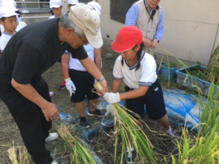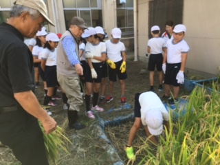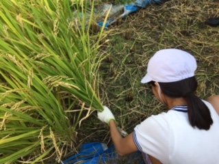 最初うまく稲を刈れなかったですが、徐々に要領がわかり、うまくできるようになりました。束ねた稲がたくさんできました。