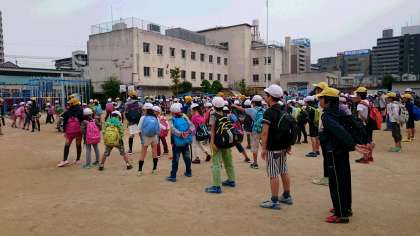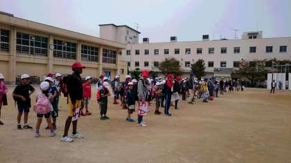 今日は全校遠足で、服部緑地に行きます。運動場にたてわり班で並んで開会式を行いました。