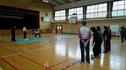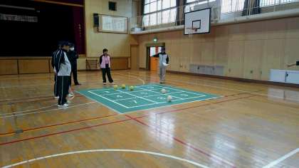 日曜日の講堂で東三国体育厚生協会の皆さんによりニュースポーツの体験会が行われました。