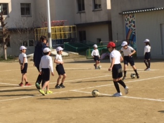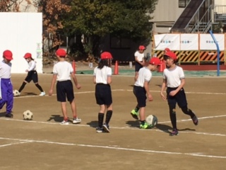 体育の授業でサッカーをしました。基本の中心に練習を行い、ボールを一旦止めてから蹴ることを練習したり、各グループごとにコートのライン上でドリブル練習しました。
