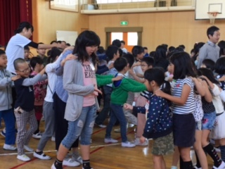 音楽に合わせて動き、音楽が止まるごとに近くの児童の列車の先頭の児童とじゃんけんを繰り返し、負けると相手の列車の後ろに繋がっていきました。どんどん列車の人数が増えていきました。2回行いました。とっても楽しかったです。