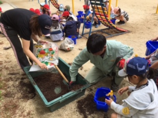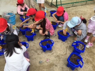 1年生は、担任の先生や管理作業員さんに手伝っていただき、一人ずつそれぞれの鉢にあさがおの種まきを行いました。種からでも非常に育てやすい植物です。、日当たりのよい校庭の隅において育てます。いまから花が咲くのが楽しみです。