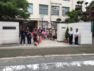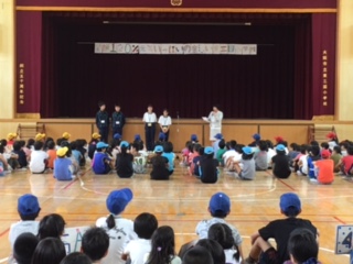 本日と明日の2日間、キャリア教育の一環として、隣の東三国中学校から4名の生徒が本校で職業体験を行います。朝のあいさつ運動から始まりました。そのあとの児童集会で校長先生から紹介があり、生徒代表によるあいさつを行いました。