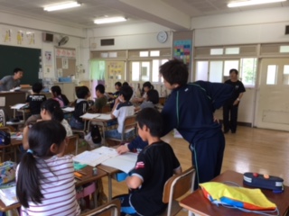1時限目は植物の世話等を管理作業員さんから学びました。2限目からは一人ずつ各学年の教室の授業に入りました。子どもたちの支援をしたり、学級担任の指示で役割を果たしていました。また、休憩時間等は子どもたちと一緒に遊んでいました。