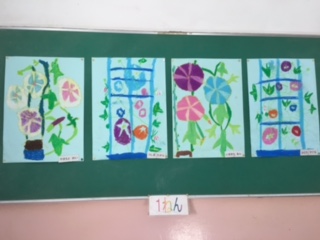 1号館の北側階段踊り場に1年生が種をまいて大事に育てているあさがおの絵が掲示されています。色あざやかに書いています。
