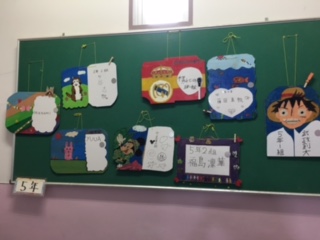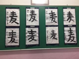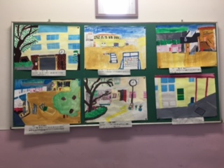 2号館の階段踊り場の現在の掲示物です。上記より、4年生は「麦」の習字、5年生は「自分の伝言板」、6年生は「校内の写生」です。