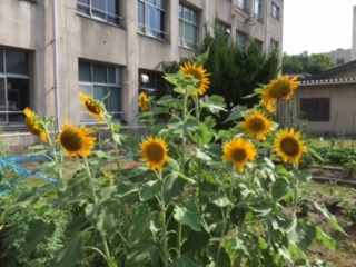 学習園では、各学年・ひまわり学級で野菜や花を育てています。今年は育ちがよく、すでに野菜はたくさん収穫できました。まだまだ育っていますので楽しみです。上記より1年生のひまわりの花、2年生のトマト、5年生のトウモロコシです。