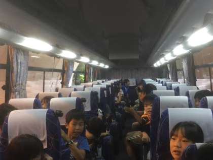バスの中でみんなで楽しくレクリェーションを行っています。