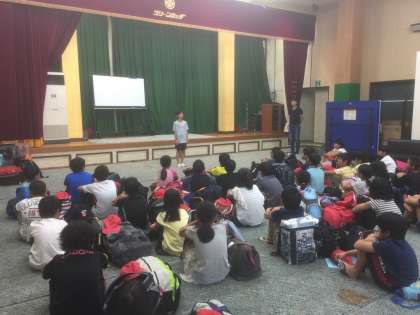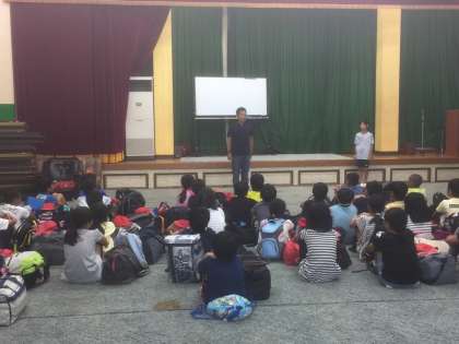 開舎式は多目的ホールで行いました。司会は1組の横山ヒロトさんです。教頭先生のあいさつ、児童あいさつは1組の相本さん、宿舎の方のお話、最後の諸注意は本田先生からありました。