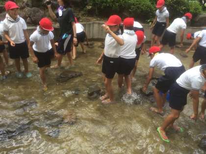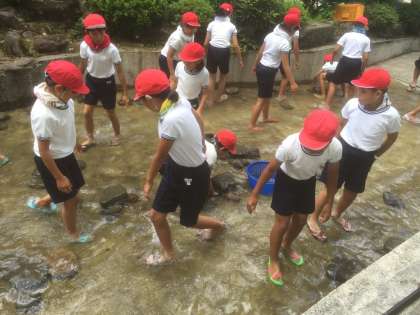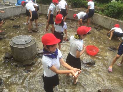 午後の行事は魚つかみです。活きのいい魚をつかむのに悪戦苦闘しています。うまくつかんだらみんなに見せています。
