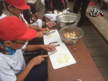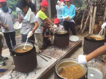 昼食のカレー作りが始まりました。宿舎の方の説明を聞き、火の起こし方からスタートしました。班ごとに食材を切ったり、かまどの係等に分かれて取り組みました。
