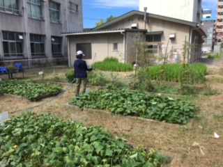 大変暑い日が続く中、毎日教職員が当番を決めて学習園の植物、花、稲の水やりをしています。順調に育ち、野菜等の収穫ができています。