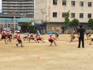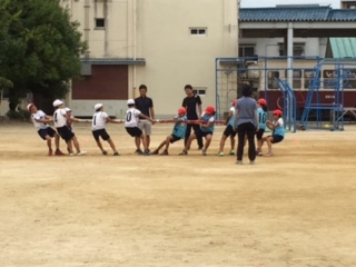 10月1日(日)の運動会にむけて練習が始まりました。学年ごとにリレーの練習や団体種目の練習を行っています。上記は、5年生団体競技の棒引きの練習です。みんな本番さながらに必死で頑張っています。