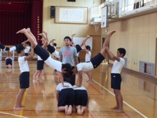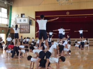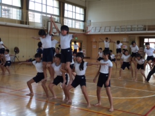 5・6年生の組体操の練習が熱心に進んでいます。現在の練習場所は体育館です。まだまだ完成には時間が必要ですが、みんなで協力して1つ1つの演技を練習しています。はやく運動場で練習ができるように頑張ります。