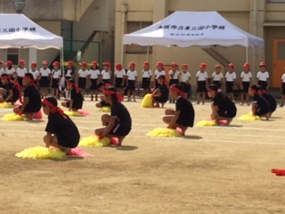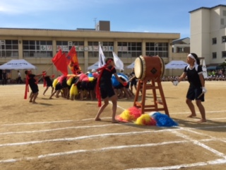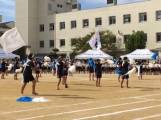 秋晴れの空のもと、第57回運動会が始まりました。入場行進、開会式のあと、紅組と白組に分かれて応援合戦が行われました。団長を中心にまとまって応援しています。