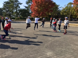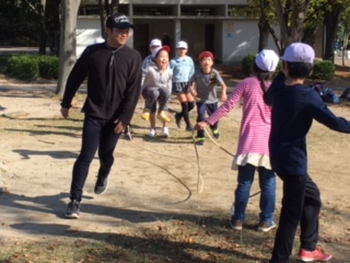 午後は、低・中・高学年に分かれて活動をしました。高学年は、大縄跳び・フリスビー・ドッジボール等でみんなで楽しく動きました。