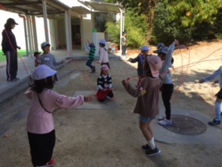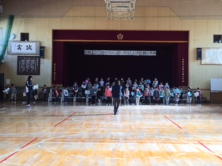 1年生は学習発表会で、劇「くじらぐも」を発表します。今日は講堂で学年練習をしました。また、劇中の場面でなわとびをする児童は、休み時間に練習をしています。上記では、なわとびで登場する以外の児童も一緒に練習をしています。