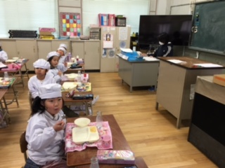 3学期最初の給食の献立は、ほたて貝のグラタン、スープ、和なし(缶)、黒糖パン、牛乳です。みんなしっかり食べていました。上記は