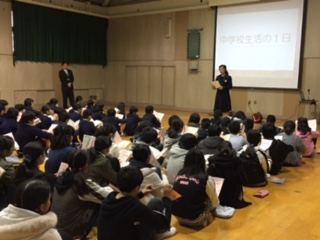 本校の6年生と新東三国小学校の6年生が4月の中学校入学に向けて東三国中学校へ行き小中交流交歓会に出席しました。生徒会のみなさんの進行で中学校の一日の生活を寸劇とパワーポイントで写真を見ながら説明がありました。そのあと冊子をもとに服装等の説明や宮脇校長先生からお話をしていただきました。終了後は学級ごとに部活動見学に行きました。お世話になりました。