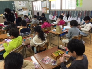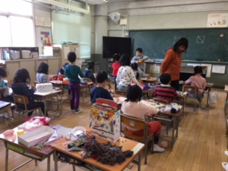 1年生は、図画工作の時間に一人一人が用意した紙の箱または紙ぶくろに、同じくお家から持ってきた折り紙を切ったり折ってアレンジしたり、色とりどりの小物や毛糸等をボンドやノリで貼りつけて、個性豊かで素敵な作品を作っています。上記より1組、2組です。