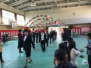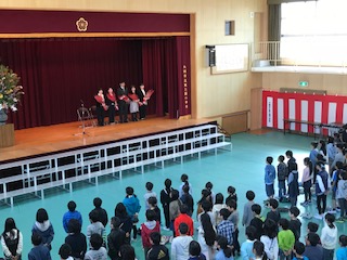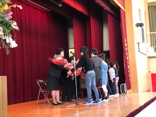大阪市の本年度人事異動により、本校より転任する教職員の離任式を行いました。代表の児童から、転任される教職員の方々に花束を渡しました。最後に一人ひとりのご挨拶がありました。今まで本校の教育活動にご尽力をいただき、ありがとうございました。