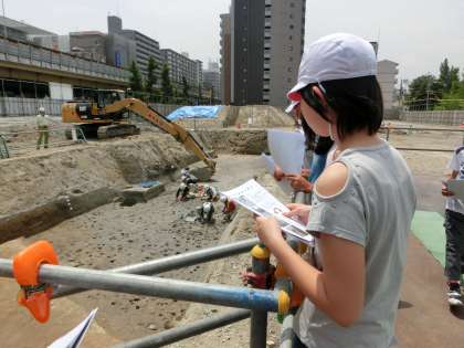 6月3日(火)旧府営住宅の跡地のマンション建築に伴い、発掘調査現場からなんと土器が出てきたそうです。そこで建設会社が急きょ5,6年生に見学会の機会を与えてくださいました。3時間目に現地に行ってきました。現場では6,7メートル掘り下げてあり、係りの方が地面をていねいに削っていました。地面には数多くの湯飲みぐらいの穴があいていました。おそらく牛の足跡だろうということでした。地層もはっきりしていて、神崎川が氾濫した様子がわかると説明を受けました。出土した土器の破片も展示してあり、手に取ることができました。ほかにもよくわかる資料もいただきました。発掘調査から古代の生活を想像したり、ロマンを感じたりしてくれたでしょうか。本当にありがとうございました。