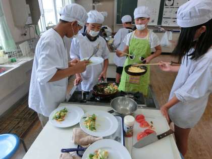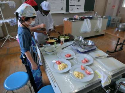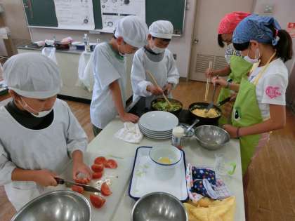 7月8日(火)ミツバチの大群も朝のうちに引っ越しを済ませ、無事にどこかへ行ってしまいました。今日は6年生の調理実習がありました。メニューは「夏の三色野菜の油いためとスクランブルエッグとトマト添え」です。グループごとに野菜を切ったり、卵をいためたり協力して調理をしていました。彩も鮮やかでした。自分たちで作ったものはさぞかしおいしいことでしょう。フライパンで作っている人がいるそばで別の男の子が使った道具を水洗いしていました。えらいなあ。さすが6年生です。機嫌よく1日を過ごせそうです。