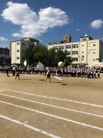 全学年が1つになって、大玉を送ります。どちらも頑張れ!