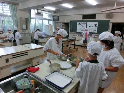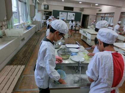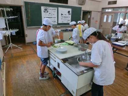 7月10日(木)台風8号が気になります。暴風警報がいつ出るのかやきもきしています。台風情報を見る限り夕方から今夜が危ないのかと思います。校内の1年の朝顔も校舎内に避難させました。学校ではさほど雨風が強くもなく、授業が予定通り行われています。5年生が家庭科の調理実習です。献立は「夏のゆで野菜のサラダと手作りドレッシング添え」のようなものでした。野菜を切ってゆでて、お皿に盛りつけます。ドレッシングはちょっと酢が多めですっぱいグループもありましたが、みんな協力しながら作っていました。苦手な野菜も自分で調理すればきっとおいしいことでしょう。家でも料理の手伝いができるといいですね。それにしても台風がどうなるでしょう。