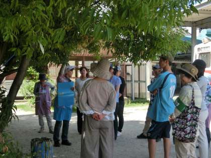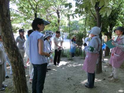 7月31日(木)「一休さんの自然工作教室」の皆さんを講師に招いて教員の研修会がありました。東三国新山の樹木のインタープリテーションです。簡単に言うと樹木観察です。自然の発するメッセージをわかりやすく伝え、自然との触れ合いを通じて喜びや感動を分かち合うといった活動です。新山にはどんぐりのなるシラカシやクヌギ、ウバメガシ、アラカシなどの樹があります。他にもエノキ、イスノキ、ケヤキ、トウカエデ、メタセコイアなどもあります。花がモモに似ているキョウチクトウには注意が必要です。キョウチクトウはなんと、有毒だそうです。絶対に口に入れてはいけない木で、触った後は必ず手洗いをしなければなりません。学校だけでなく、街路樹や公園樹としてあちこちで見かけますが十分気を付けてほしいです。キョウチクトウは気を付けようです。