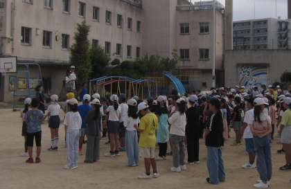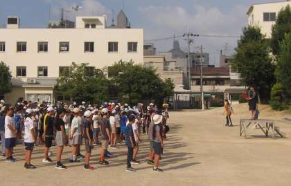 久しぶりに、運動場での児童朝会です。日が射すとまだまだ暑いですが、今朝は少し雲が出ていて、程よく曇ってきました。