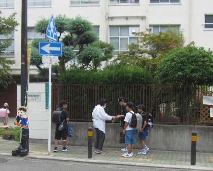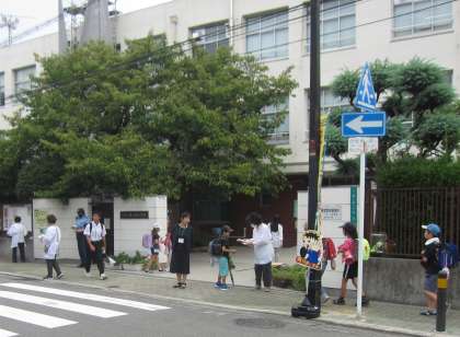 24日(水)の朝の登校時には、地域の女性会の皆さん、警察やセイフティー淀川の方々が、正門前でパンフレットとティッシュを配りながら、交通安全の呼びかけをしてくださいました。