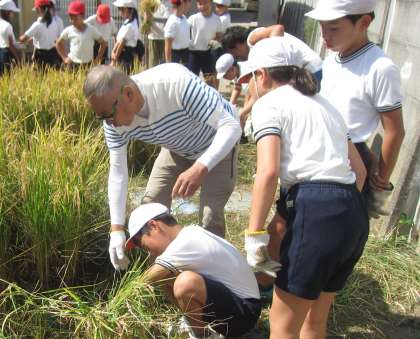 5年生が地域の皆さんに手伝っていただきながら、「稲刈り」に取り組みました。
