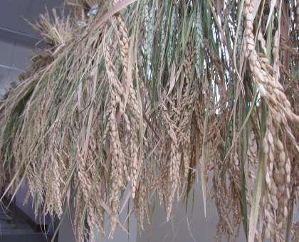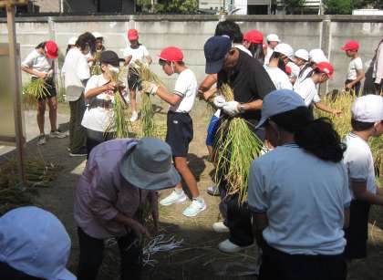 刈り取った稲を天日で干すことを「稲架掛け(はさがけ)」というのだそうです。ゆっくりと乾燥させることで、うまみや甘みが増すそうです。5年生の教室のある3階廊下が、稲わらの香りに包まれました。