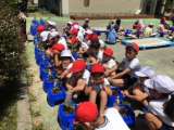 縦割り班遊びで「転がしドッジボール」を行いました。 楽しくできました。