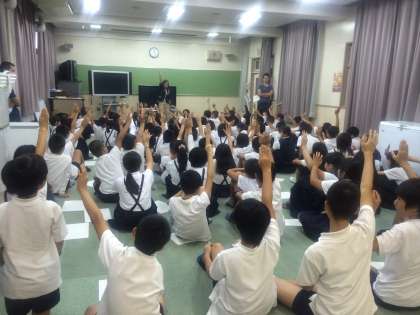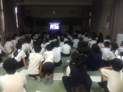 今日の3時間目、5・6年生合同で運動会の組体操に向けて、意義や心構えなどについての話をしていました。先生たちが夏休み研修してきたビデオを視聴すると、「こんなん無理!」という声も最初は、出ていましたが、先生の話にだんだん「よし、挑戦してみよう!」という思いに代わっていったようです。