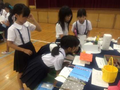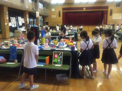 子どもたちは、友達や他学年の作品に見入って「これ、どうやって作ったん?」とか「私も今度この実験やってみよう!」などと、いろいろ刺激を受けています。一人で6点も作製した子もいました。今年は、自由研究に挑戦した子がたくさんいました。絵画、工作などもたくさんのステキな作品がそろいました。来年の夏休みの参考になればと思います。おうちの方々のアドバイスや応援も大変だったでしょうね。子どもたちも自信がついたことと思います。ありがとうございます。