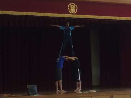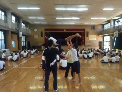 蒸し暑い体育館の中で、昨日から練習がスタート。先生の手本をしっかりてポイントを押さえながらそれぞれ挑戦です。一人技、二人組、三人組とだんだん難しい技に、真剣な子どもたちです。痛い、重たい、怖い、しんどい・・・さまざまな思いをはねのけ、一人一人の成長を願います!