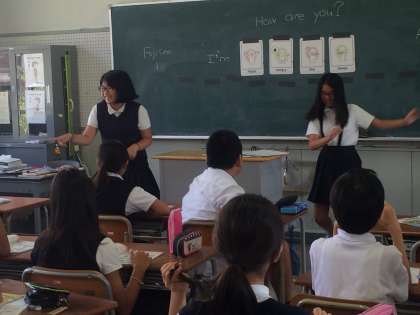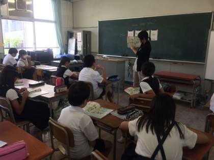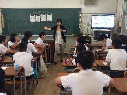 先生や子どもたちが、ジェスチャーをしてそれを英語で答えるゲームをしています。エイミー先生の英語での説明を何回か聞くと、だんだんわかってきます。でも、わからなくてもまず声を出すことが大事かな。