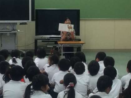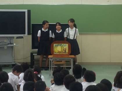 「どうやってねるの」のお話では、いろいろな動物の寝方について想像をふくらませたり、寝方を聞いてびっくりしたり。「おけやの天のぼり」という紙芝居では、奇想天外なおもしろさ、オノマトペ(擬態語・擬声語)のおかしさにぐいぐい引き込まれていた1年生でした。図書委員会の5,6年生も楽しんで聞いていました。