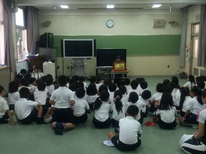 今日は、2学期最初のお話会でした。図書室が工事中のため、多目的室で行いました。