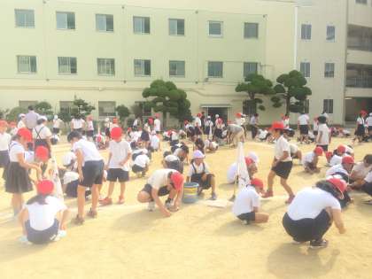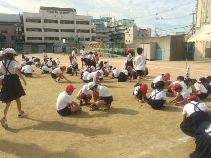 今朝の児童朝会で運動場の石を拾いました。5,6年生は、裸足で組体操をするため、特に念入りに拾っていました。けがをしないようにと願います。