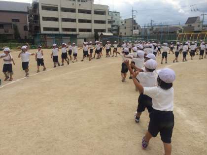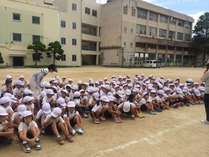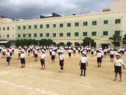 だいたいダンスの振り付けも、踊る場所も覚えました!ポンポンを付けた手を大きく振って、1年生は南側から、2年生は北側から退場します。
