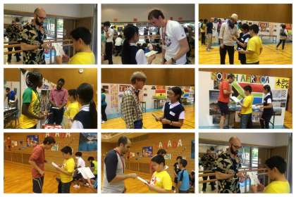 Cネットの先生たちが、ずいぶん前から企画準備してくださり、子どもたちがふだん英語活動で学んでいることを生かしてゲームをしながらコミュニケーションをとったり、インタビューをしたり、サインをもらったりとたっぷり英語に浸ることができました。さまざまな国や地域の文化や遊びにふれ、たくさんの人と会話を楽しむことができた一日でした。