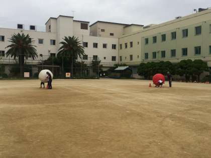 2年生は、直線ではなく、トラックを走ります。カーブに気を付けて走ります。大玉運びは、二人の気持ちをうまく合わせて、一生懸命運びます。大玉を台にのせるのがなかなか難しいです。
