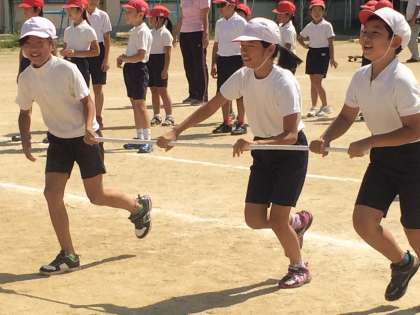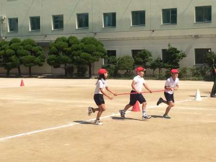 「台風の目」は、3人が気持ちを合わせてコーンを回り、戻ってきたらチームのみんなも心を一つにして棒をうまく跳ばないといけないのでなかなか大変です。自分勝手をしていては、勝てません!!難しい技に挑戦です!!